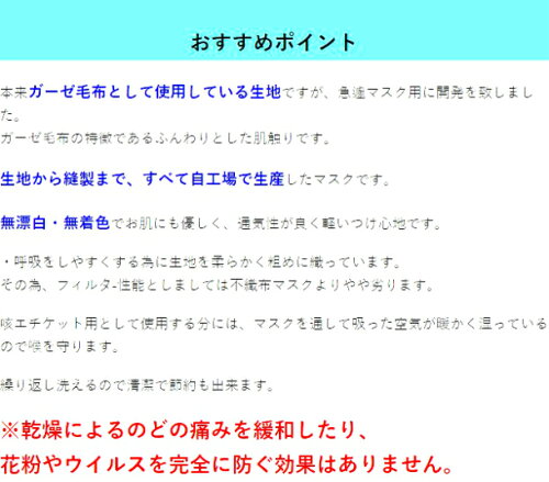 洗えるガーゼマスク 薄手タイプ 小さめサイズ (約16×11cm) おすすめポイント 本来ガーゼ毛布として使用している生地ですが、急遽マスク用に開発を致しました。